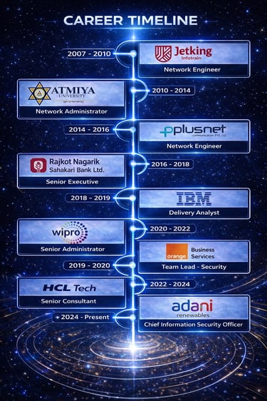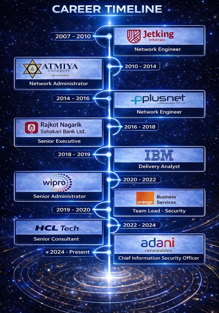 My professional journey spans global technology leaders and critical infrastructure enterprises, shaping a strong foundation in cybersecurity, OT security, and large-scale transformation. I began my career with Wipro and IBM, gaining deep exposure to enterprise security, consulting, and global delivery models. At Orange and HCL, I worked across complex telecom and technology ecosystems, strengthening cyber resilience at scale. Currently at Adani, I focus on securing renewable energy and critical infrastructure, aligning cyber-security with national importance, business growth, and future-ready digital leadership.